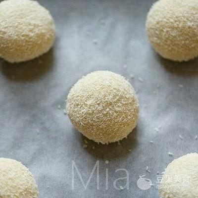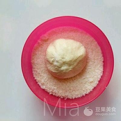 9、表面喷一层清水(或者刷全蛋液)放入椰蓉中裹满表面,取出后轻拍表面几下