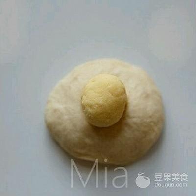 8、再次滚圆后压扁面团,放入奶酥馅包起,收口紧紧捏合