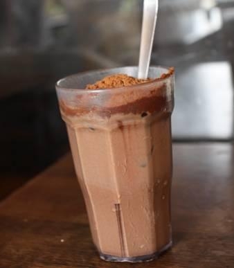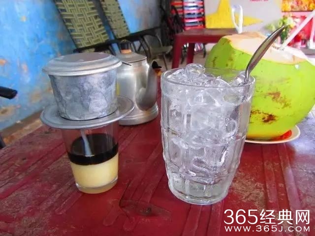 说到越南饮品绝对少不了越南的咖啡。店家端上的咖啡都是现滴的,在杯子上有一个钖制的滴漏,里面放了研磨好的咖啡,用热水冲下,然后让咖啡慢慢滴下来,炼奶已经先加在杯子里,待咖啡滴得差不多了,再用汤匙搅拌,最后再倒进装冰的杯子里。而且店家不会给你加鲜奶,一般都是甜腻腻的炼乳。