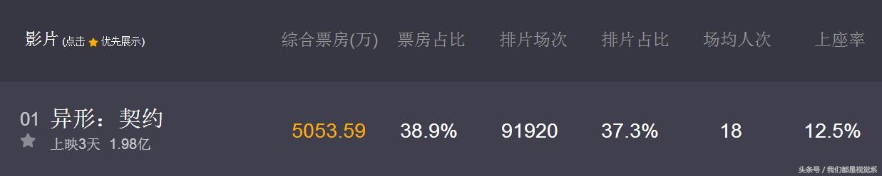 异形契约已经上映3天了,3天累计票房只有1.98亿,昨天排片场数高达9万场,但是最终票房入账只有
