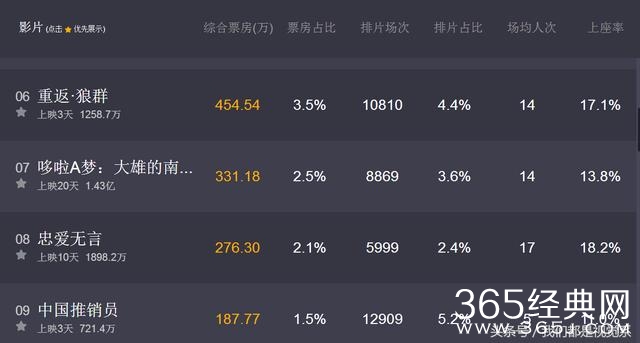 而其中表现不错的,有重返狼群,忠爱无言,中国推销员,这3部电影都有过百万。上座率也不错。