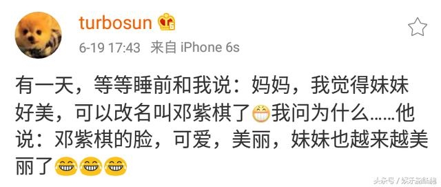 19日孙俪在微博替儿子等等向邓紫棋表白:等等说,妹妹可以改名为邓紫棋了,因为妹妹越来越美了!
