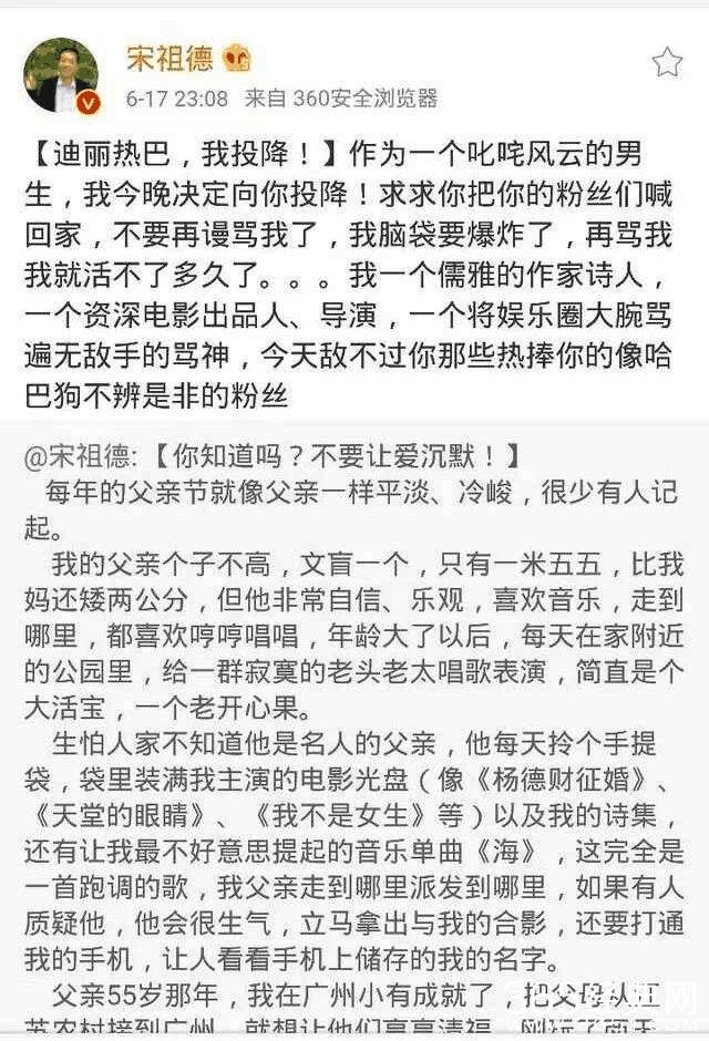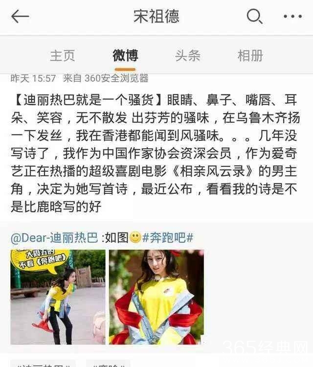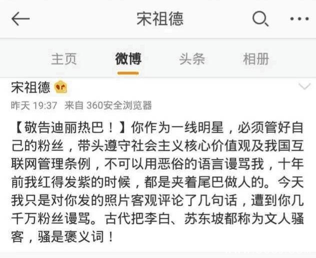 宋祖德一个靠着诽谤炒作为主的人,人送外号“”宋大嘴。曾说过刘亦菲是男人、林心如霍建华离婚,现如今又指向了迪丽热巴。