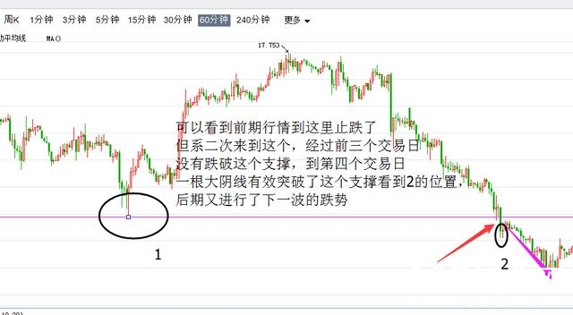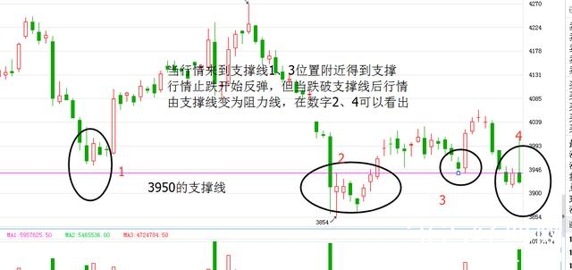 从图二也可以看出,当这根线在前期形成有效的支撑位置,当看到标注2的位置,价格总共是有四次的去测试,前三次都败兴而归,当第四次一根大阴线有效突破,稳稳收于压力线的下方,接着第二日又来测试这个支撑线的牢靠度,非常扎实,就默默的往下走了。因此我们可以在跌破后的一个交易日进场或者稳健的选择在测试完毕后进场也可以的。