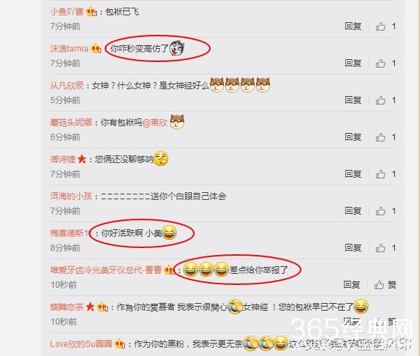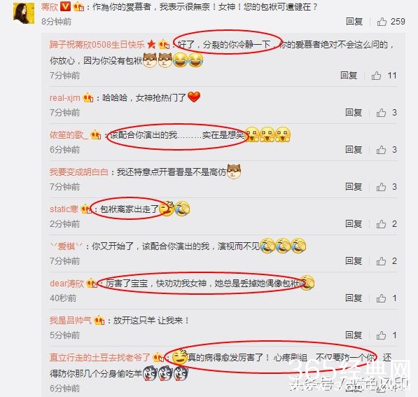 更搞笑的是,蒋欣竟然自己抢沙发评论自己的微博道“作为你的爱慕者,我表示很无奈!女神!您的包袱可还健在?”哈哈,不知道的网友还以为又是高仿号呢。