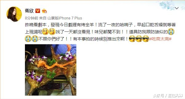 近日演员蒋欣正在忙着拍新戏,不想却被剧本中所说的烤全羊诱惑了,发微博写道“昨晚看剧本,发现今日戏里有烤全羊!流了一夜的哈喇子,早起口干舌燥就等着上现场呢!找了一天都沒看见!味儿都闻不到!!道具防我跟防狼似的!不跟你们好了!!有本事拍的时候別推出來啊!”娘娘的吃商实在太高,道具都不得不防啊,哈哈。