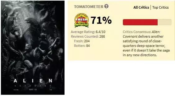 在烂番茄网上,《异形:契约》的烂番茄保持在71%,与上一部《普罗米修斯》不相上下。