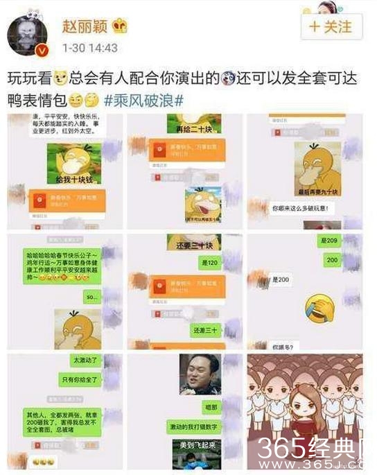 赵丽颖发微博表示终于有人陪她玩了全套可达鸭表情包,这个配合演出的就是林更新!