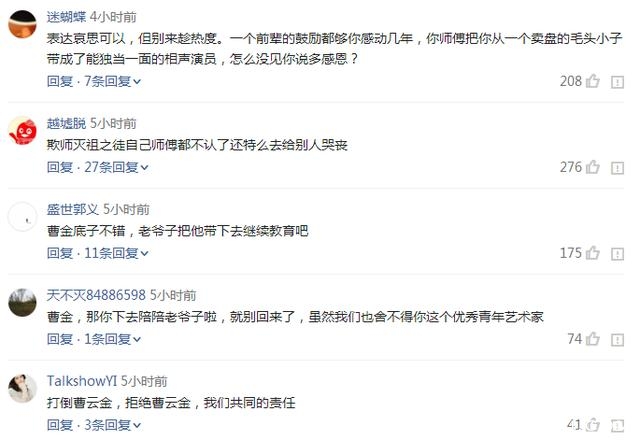 “欺师灭祖之徒连自己师傅都不认,还给别人哭丧” “见面一句客气话,老爷子估计都不知道你是谁” “又出来显摆,借机炒作!””打倒曹云金这是我们共同的责任“