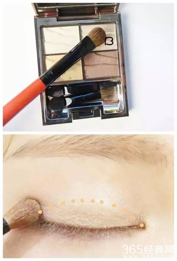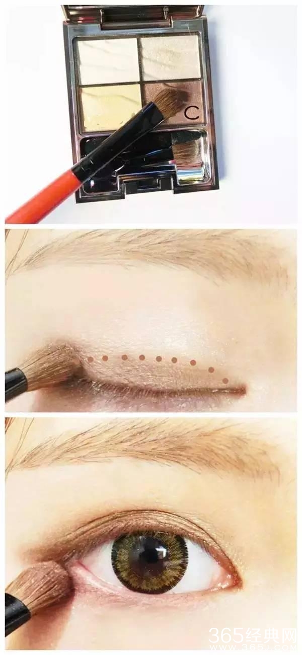 3,用眼影刷蘸取C色,刷在双眼皮褶皱处。范围如图。然后顺带下眼睑。