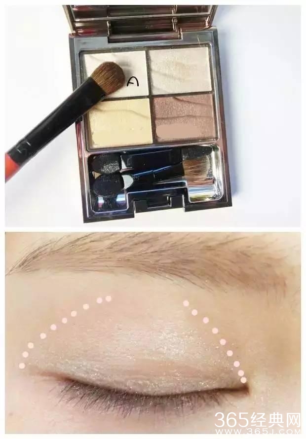 1,首先用眼影刷蘸取A色大面积刷在眼部,范围如图。