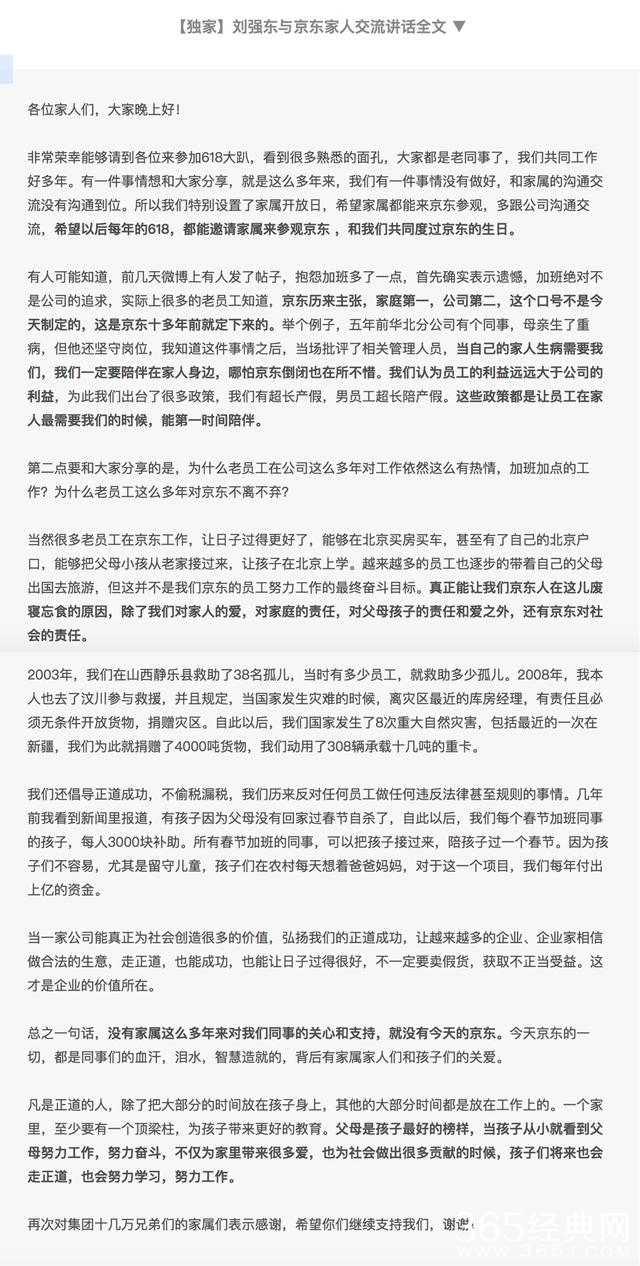 这是刘强东在618狂欢趴上的讲话全文。学校里有家长开放日,没想到公司还有家属开放日哦!刘强东说他们有一件事没有做好,就是与家属之间的交流沟通。看来有了孩子的刘强东很懂得体恤员工的精神需求,知道孩子和家属是每个员工除了工作以外很重要的一部分。他还表示京东十多年来历来主张家庭第一,公司第二!最后他还表示了一个家至少要有一个顶梁柱,父母是孩子最好的榜样,为孩子带来更好的教育!很赞同刘强东表达的关于教育上的观点!