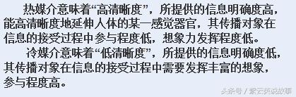 依据加拿大学者麦克卢汉的媒介论:依据媒介提供信息的清晰度或明确度及信息接受者想象力的发挥程度及信息接收活动中的参与程度,将媒介划分为冷媒介与热媒介。