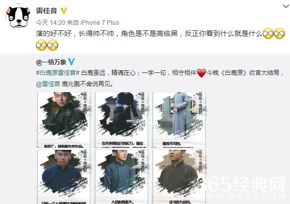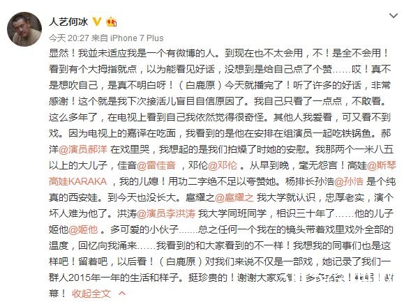 虽然这部剧已经谢幕,但是演员们依然有很多的不舍,连从来不懂不会用微博的何冰老师都学会了用微博,而且今晚也发了一段感人的话,他说“我并未适应我是一个有微博的人。到现在也不太会用,白鹿原播完了,我自己只是看了一点点,不敢看,留着吧,以后看,这对我们来说不仅是一部戏,他记录了我们一群人2015年一年的生活和样子,挺珍贵的,”最后他谢谢大家观赏,很诚恳,话很实在。