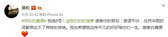 邓伦“感谢你的那句:言语平淡,任何华丽的词都表达不了带给的惊艳。我也希望就这样平凡的好好陪你们一生。感谢白鹿原”