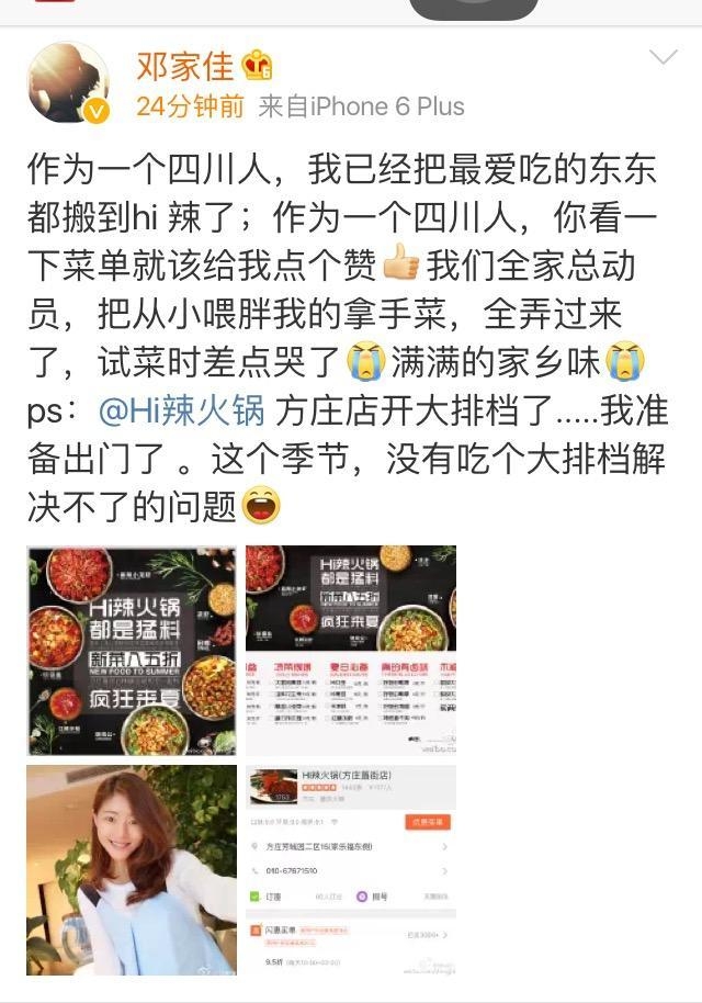 娱乐圈众多明星除了拍戏很多还有自己的副业,特别是餐饮业是很多明星的首选。吴昕的泰国餐厅,李晨的面馆,黄晓明的奶茶店,孟非的小面以及黄磊的黄小厨等等。当然即使投资到餐饮还是有一定风险的,有人做的风生水起,有的却是生意惨淡。因《爱情公寓》而大火的小姨妈邓家佳的“Hi辣火锅”,也不甘示弱进入此圈,并且还做的是相当的不错。