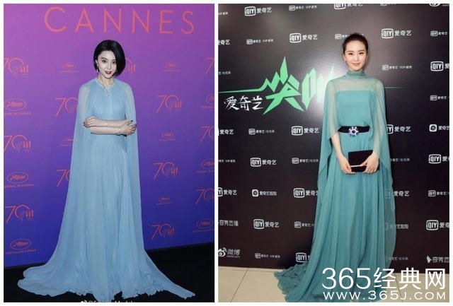 范冰冰的这条长裙和刘诗诗这条很相近,是定制的100万以上的高档昂贵礼服,但由于范爷骨架大,虽然五官标致,但并不适合这种包裹全身的披风,显得臃肿,但诗诗的骨感身材使这件几万块的衣服十分得体。