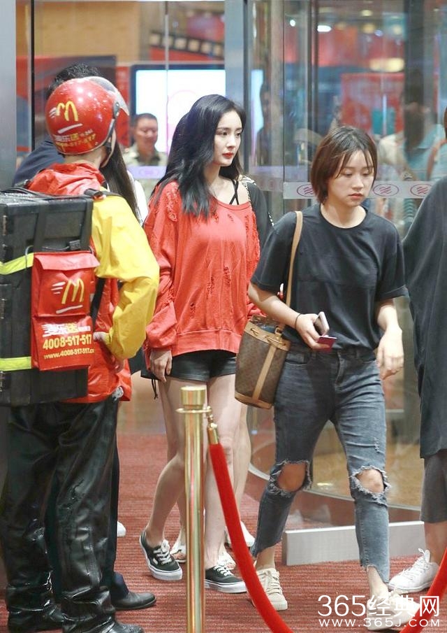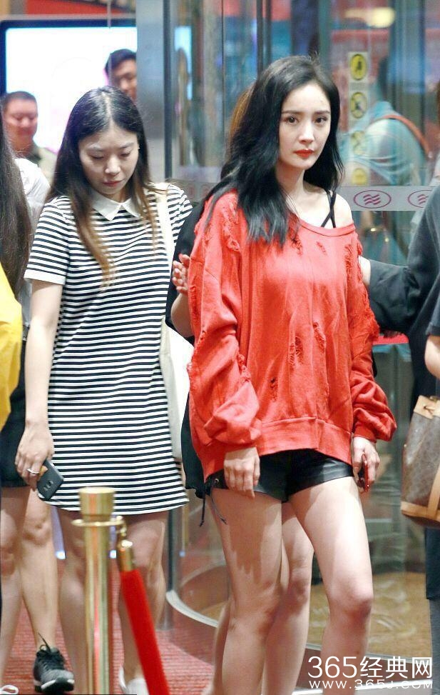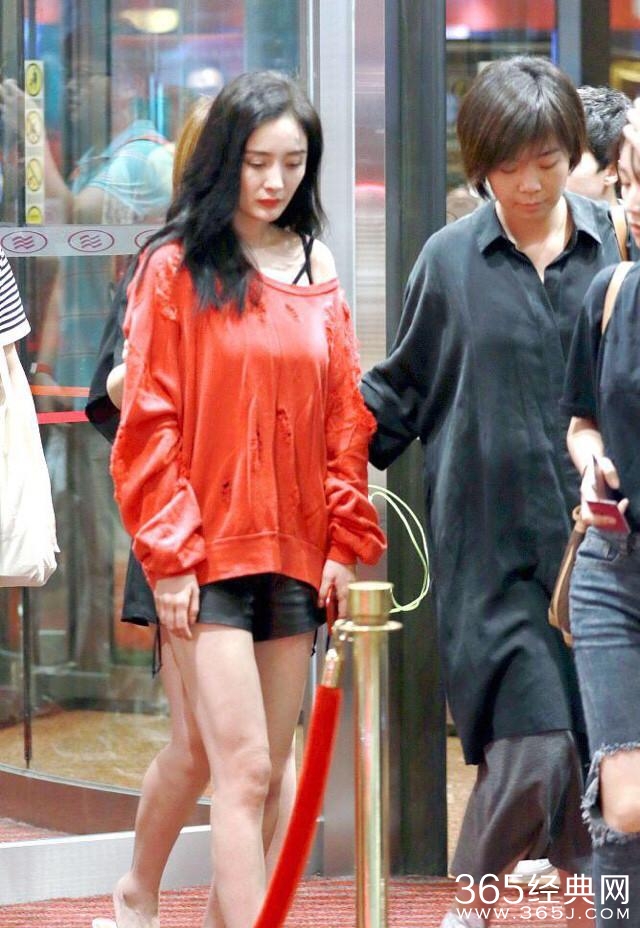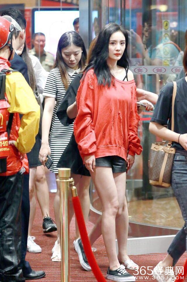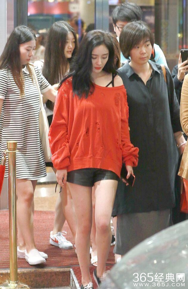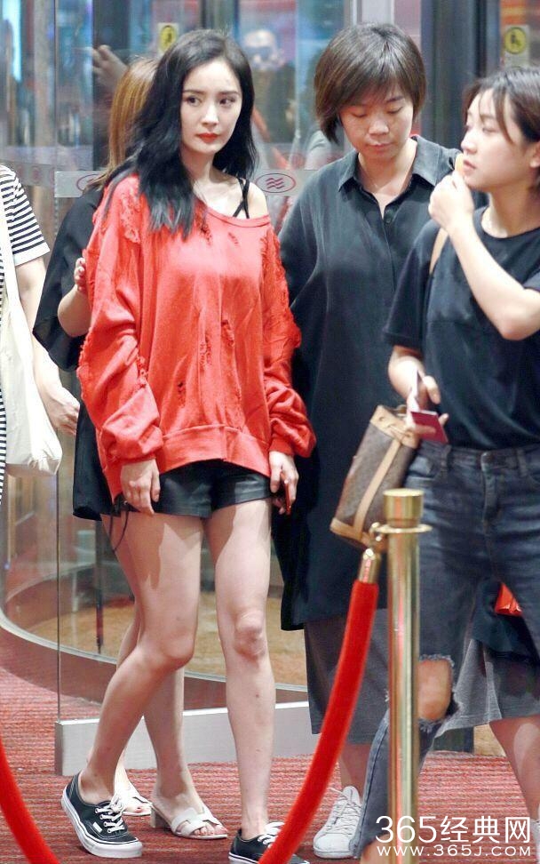 近日,杨幂在上海某酒店现身。当日她穿一件红色破洞长袖斜肩T恤,并且露出了里面内衣的黑色带子哦!下身穿一件黑色短皮裤,在助理的陪同下走出酒店。外面正下着大雨,她们正等着车子来接。感觉杨幂头发有些凌乱,似乎是刚起床的样子,状态也略有疲惫的感觉。