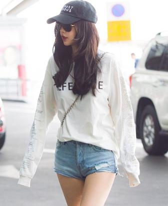 近日baby现身机场,肩挎精致桃心形状的小包,穿白色T恤,配牛仔短裤大秀好身材,亮眼红唇气场十足,整体造型利落时髦。