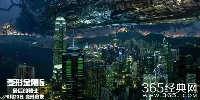 (图为外星巨型战舰略过地球城市上空。)