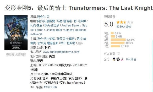 《变形金刚4》上映时,豆瓣评分6.6,烂番茄18%,中国内地票房19.77亿,北美票房2.46亿美元,票房相差近3亿人民币,口碑却相距甚远,但来到第五部,中国观众的评价也终于和北美主流评价一致,《变形金刚》系列在中国评分首次不及格,也说明了中国观众对该系列“不思进取”的做法出现了厌倦和疲惫。