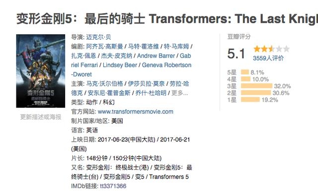 当然《变形金刚》拍到第五部,依然没有跳出套路的窠臼,曾经信誓旦旦说不拍的迈克尔·贝坚持拍到了第五部,还松口说要拍单人衍生电影。在拍变5的时候还启用了三个编剧,还卖了把高质量的《美丽心灵》编剧的点,结果成片是个残次品。网友说变5连普通观众喜欢的爆米花商业电影的程度都赶不上,嗨没嗨明白,叙事乱七八糟,剪辑一塌糊涂,充满套路和硬伤,黑化的擎天柱可以一秒变好,里面的笑点蜜汁尴尬。
