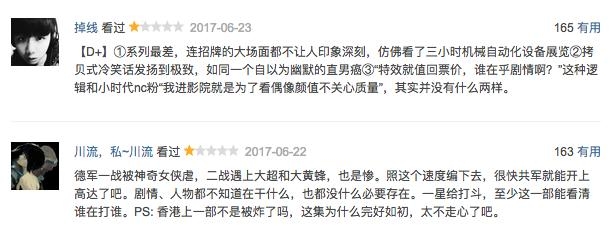 午夜场票房过亿,多半是冲着情怀来看,不过口碑这么差,接下来的票房如何要打个问号。看好莱坞特效大片观众有底线的,不是所有的大片都买账,早已过了看着爽就能卖钱的时期。拿《速度与激情8》来说,豆瓣评分7.1,猫眼评分9.3,总体而言分数不低,说明影片质量相对有保障,在剧情合理、逻辑正常、演技在线的前提下,特效才是锦上添花,否则就只能被吐槽“视觉高潮”,看完脑子里什么都没留下。
