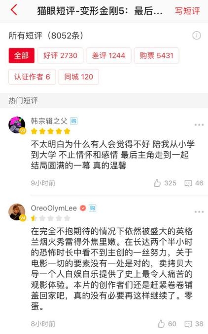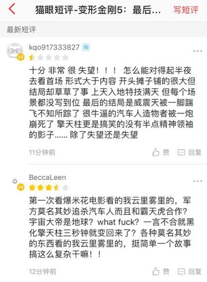 全场尿点,睡满全场,系列最差看来实至名归,说外媒乱说的人可以闭嘴了。《变5》零点场的表现足以说明一切,有人说豆瓣评分太尖酸刻薄,不能代表普通大众。那猫眼的评分可以代表普通大众了吧,2.4万人评分,短评8052条,购票用户5431条,差评竟然有1244条;豆瓣上看过的短评2256条,有82%的人给出了3星以下。