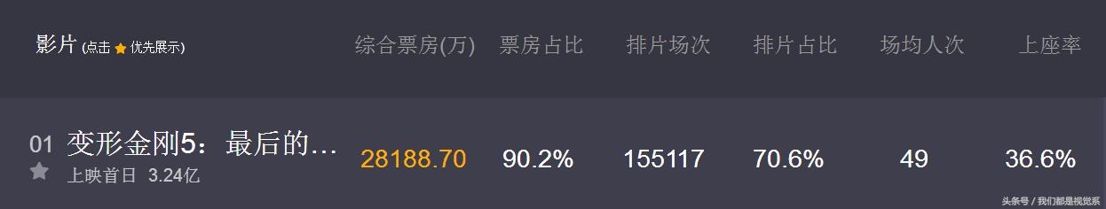 变形金刚5毫无意外的取得昨天的冠军,排片占比达到百分之70。排片场次1万5千场,场均人数达到49人。票房砍下2.8亿,败给了当时速8上映时候的4.1亿。但这数据还是相当漂亮的。