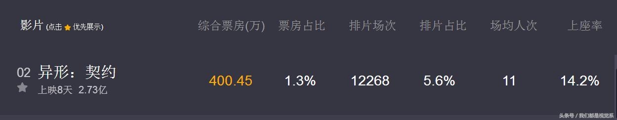 异形契约作为上映不久的大片,昨天排片也只有1万2千场。票房只有4百万,排在第二名。