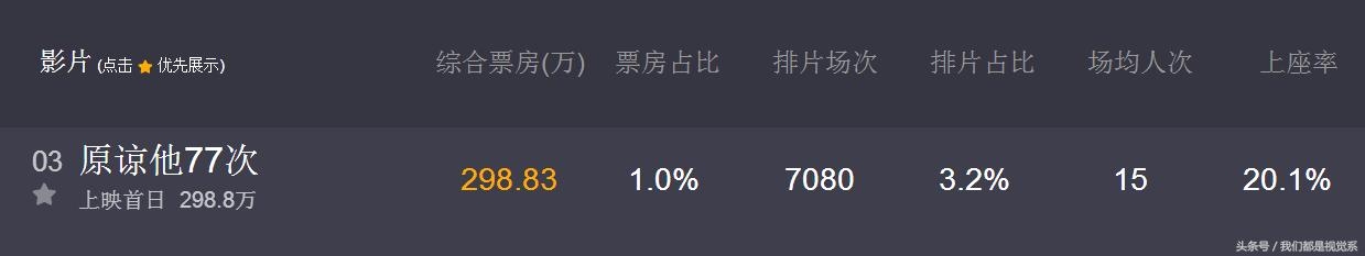 而国产电影有3部跟变形金刚5同期上映的。有一部叫原谅他77次,属于港片,全天入账298万,排在第三名。