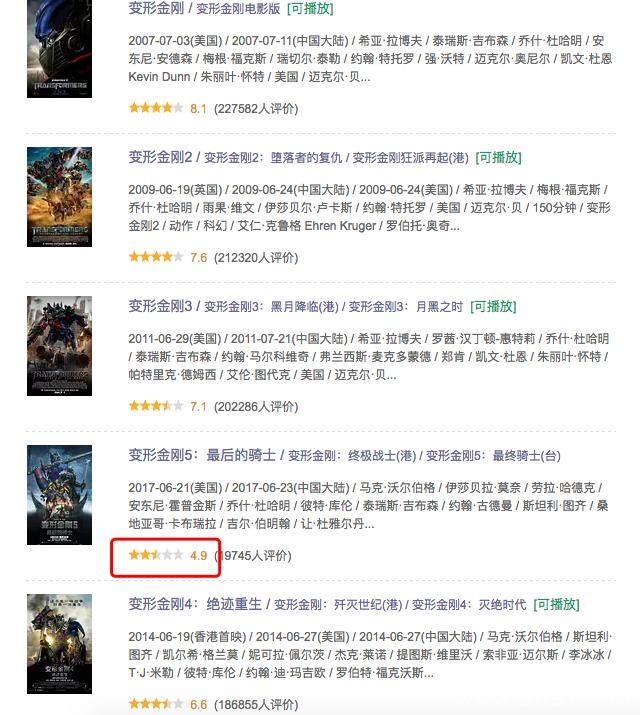 但同时,这也是评分最低的一部变形金刚电影,豆瓣只有4.9分,且大有下滑之势。