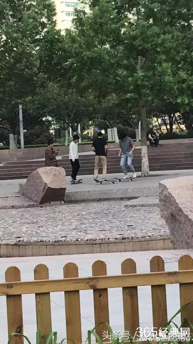 窦靖童和友人一起玩滑板,周冬雨就在旁边玩着手机陪同。