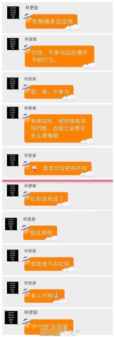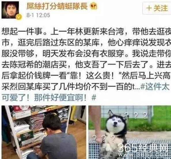 还有林更新朋友曝光说:林更新去台湾,带他逛夜市,路过某库,林更新说明天发布会衣服没带够,想去买衣服,他朋友就带林更新去陈冠希的潮店买,林更新支吾了一下进去了,进去一看价钱牌,靠!这么贵,然后就兴高采烈回某库买了几件均价不到一百的t...”哈哈哈,林狗真可爱!