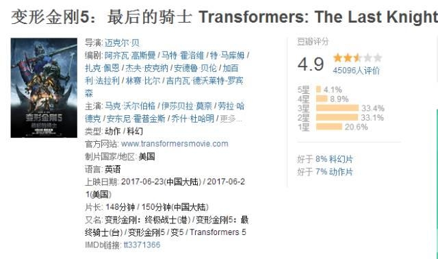 就连豆瓣电影上的评分,也只有4.9分。要知道,变形金刚系列可是拥有一大批忠实粉丝的。但是这第五部这样糊弄你的粉丝们,只为了大笔圈钱,真的合适么?