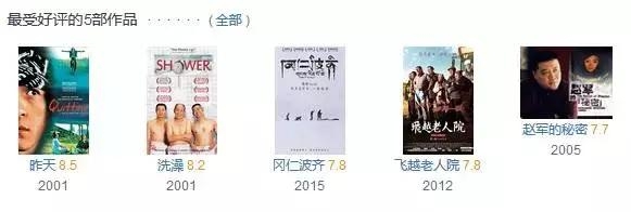 作品在豆瓣上几乎全部超过7分以上,对于近些年的华语电影导演来说,尤其难得。