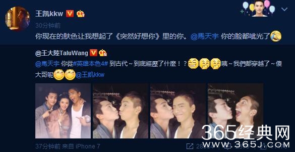 哈哈,你这是要吃掉马天宇了,王大陆又吃小孩了 这次吃的还是马天宇~~而傻大哥王凯随机转发了此微博,配文:“你现在的肤色让我想起了《突然好想你》里的你。馬天宇你的脸都呲光了”