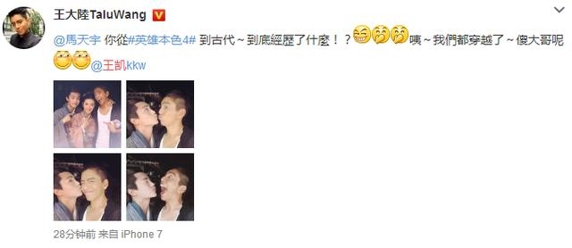 而刚刚王大陆在微博发了和马天宇、万茜的合照,并配文“你从《英雄本色4》到古代~到底经历了什么?咦~我們都穿越了~傻大哥王凯呢”