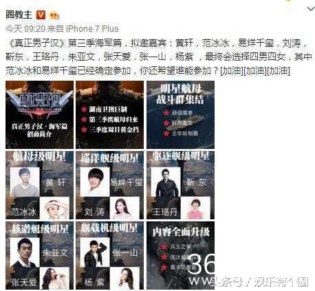 第二季,黄子韬,杨幂,佟丽娅等人的加盟,为节目带来的很多的亮点和话题。近日,有微博网友爆料《真正男子汉3》的嘉宾名单, 称范冰冰、朱亚文、易烊千玺、黄轩已经被邀请参与本季的录制。