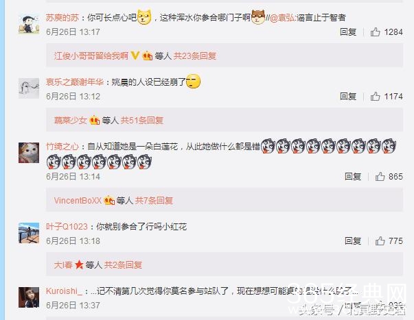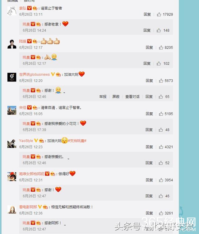 此番言论一出立马引来了微博上众多大V的转发力挺,由于姚晨的微博设置不允许普通的微博用户评论,于是大家都可以看到成群的大V评论了,可能是被骂的太惨,姚晨一个一个的回复这些力挺她的评论,可以看出现在的姚晨确实急需舆论支持,而评论中点赞最高的就是袁弘