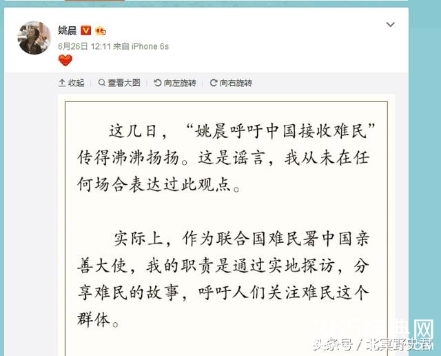 最近姚晨关于难民的言论越来越受到大家的关注,正当大家反对姚晨的情绪越来越高涨的时候,姚晨在微博上发文,声称关于自己说呼吁中国接受难民的言论是谣言,自己从未说过这种言论,自己作为联合国难民署的亲善大使一直是呼吁关注难民这个群体,自己会坚持这份工作,相信误解和质疑总将会消散