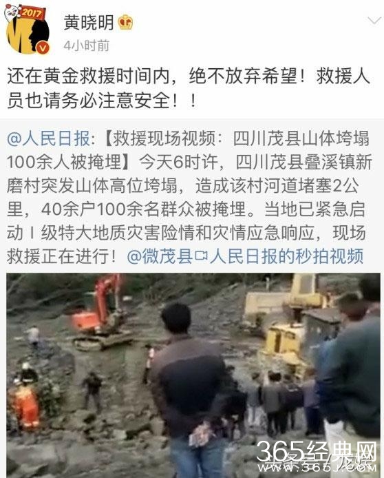 6月24日,四川茂县发生山体垮塌,原本一个美丽富饶的小村子在一夜之间夷为平地,造成了100余人的死亡。灾难后一些明星参与了救援和捐款,比如黄晓明创办的明天爱心基金就先期拨付的30万元善款,并表示将根据情况追加援助。