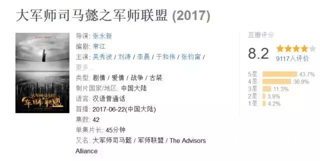 然而在播出9集之后,这部剧在豆瓣打分人数还没过万。要知道早在播出之前,《军师联盟》提前上线的预告片秒杀一众国产剧,带有电影质感的画面,采用沉郁自然的色调,被评为“拯救暑假的良心大剧”。