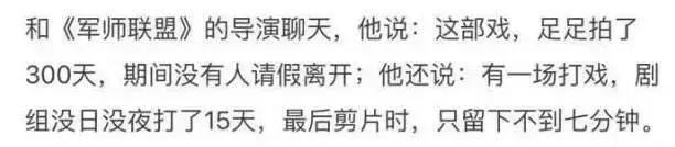 而剧里出现的打戏多是亲自上阵,很少使用替身。为了拍摄这部剧,李晨暂停自己首部自导自演的电影;杨修的扮演者翟天临拍马戏时曾坠马受伤;吴秀波则从几十层高的台阶上摔下,修养不到一周便带伤上阵。这就是一个认真到变态的“处女座”剧组,难怪横店里的群众演员最害怕去《军师联盟》剧组,因为“最苦最累”。