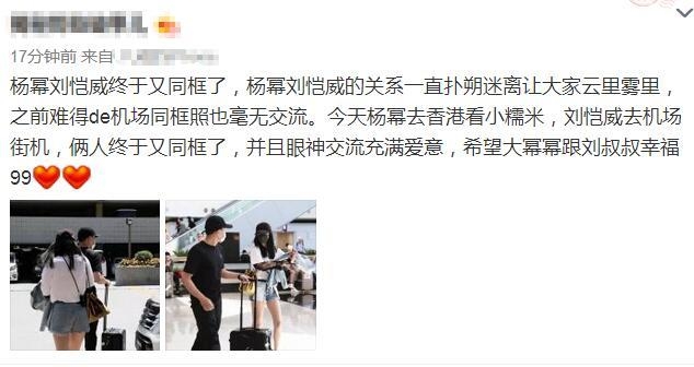 杨幂(女影星)和刘恺威又同框了,网民爆料杨幂(女影星)去喷香港看小糯米,刘恺威去接机爱意浓浓。祝愿这一家三口一向好下去。