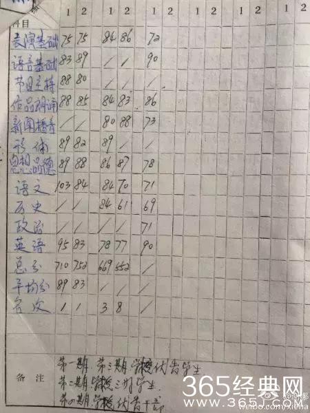 她还留言感慨说:“记得我第一次去四川电影电视学院面试,那时因为专业基础太差没有通过,但最后同意我跟着快毕业的一届读最后一个月。这一个月几乎没有人管我,我每天到学校后面的田地练习大声说普通话。跟读一个月之后,我以成绩第一的成绩考入了学校!哇!翻到当年在学院的成绩表,我都快忘了以前我当过学霸呢!”
