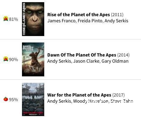 对比前作《猩球崛起》与《猩球崛起2:黎明之战》来看,《猩球崛起》这个系列都保持了较高的媒体评分,《猩球崛起3》更是创造了该系列的巅峰。