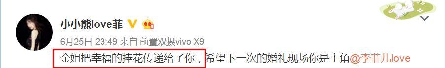 其实这束捧花对李菲儿来说意义非常重大:步入娱乐圈这么多年,她很努力,却从没有大红大紫过。交了几任男朋友却没有一段恋情修成正果,快30岁了还没有合适的对象。她需要鼓励,需要安慰,需要这束捧花。