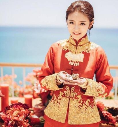 不过小编还是觉得下面这一套中式的凤袍比较好看啦,衬得安以轩十分娴静乖巧啊~