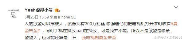 其实早在几天前,郑爽就曾经有过这样的一段话语“人的欲望可以撑很大,就像我有300万粉丝 想强迫他们把电视机打开准时收看《夏至未至》 ,同时手机在播放ipad在播放,可是我并不能。所以不是欲望是想象,望望天,也可能还算是__日__”